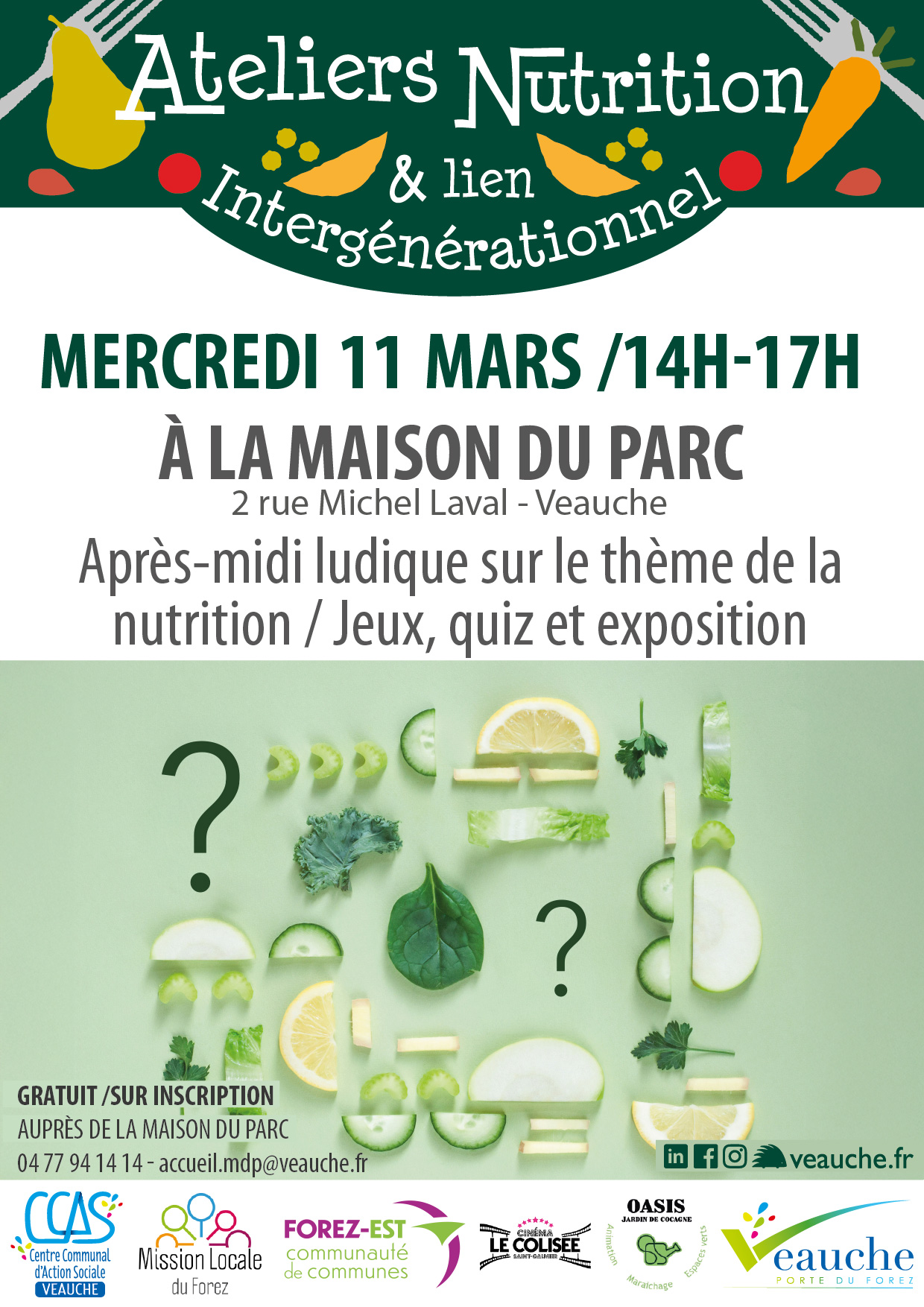📍 Lieu : MAISON DU PARC Veauche puis MEDIATHEQUE de Veauche (après-midi ludique sur le thème de la nutrition avec Jeux, QUIZ et exposition…)